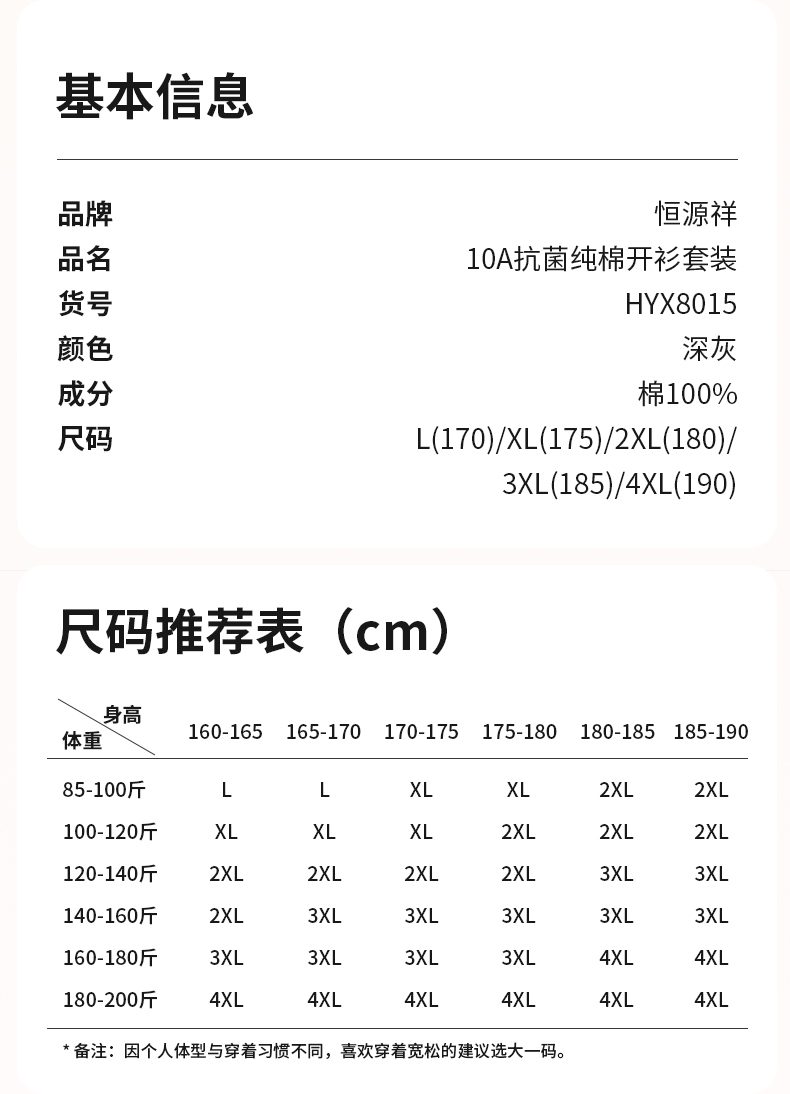 商品名称:(世星阳光)+恒源祥 10A抗菌纯棉开衫套装 HYX8015 规格 170 175 180 185 190 男款 颜色 深灰 下单备注尺码 保暖 抗菌亲肤
