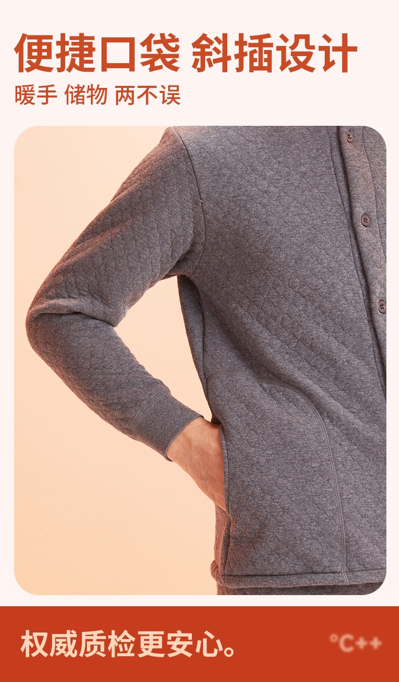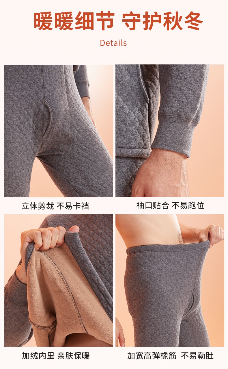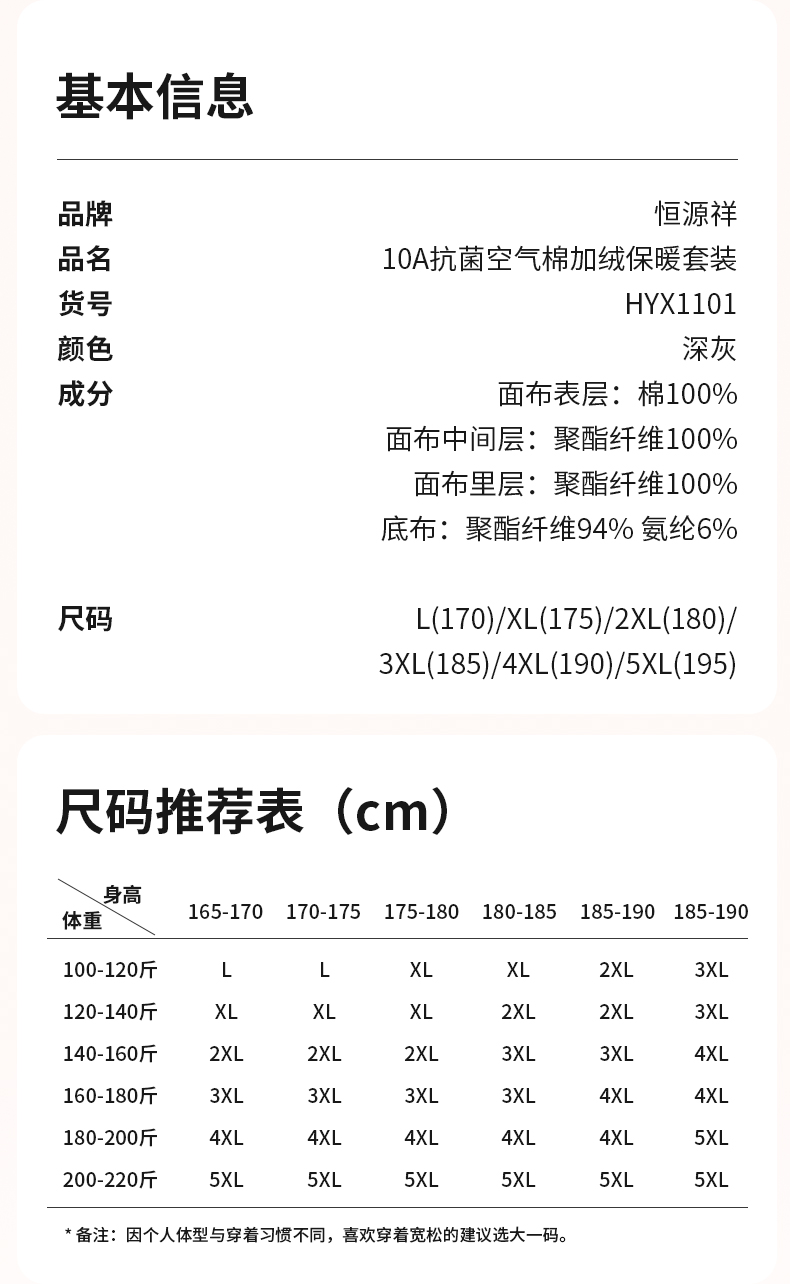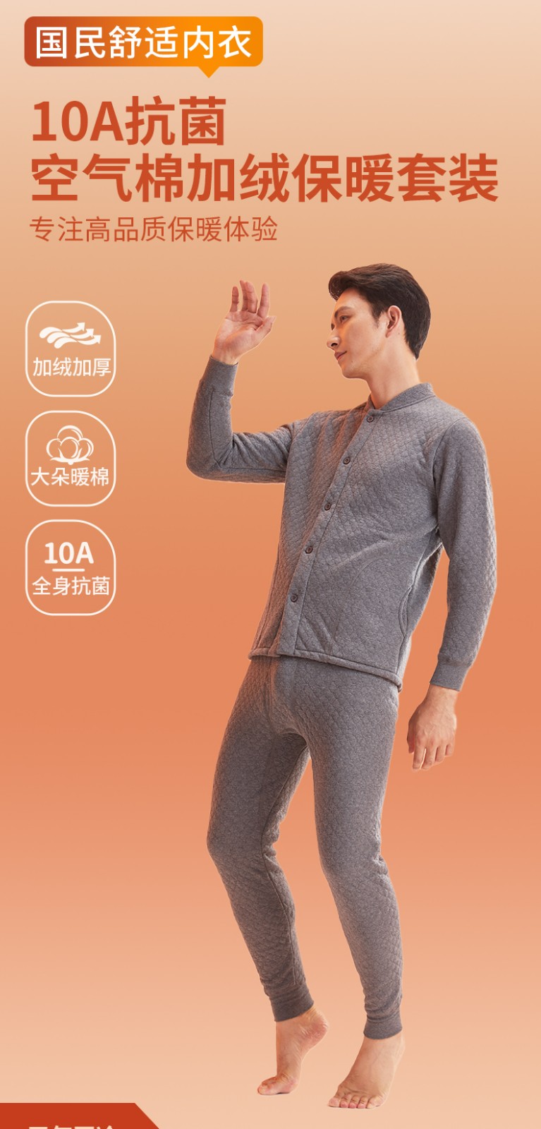 商品名称:(世星阳光)+恒源祥 10A抗菌空气棉加绒保暖套装 HYX1101 规格 170 175 180 185 190 男款 颜色 深灰 下单备注尺码 抗菌保暖亲肤