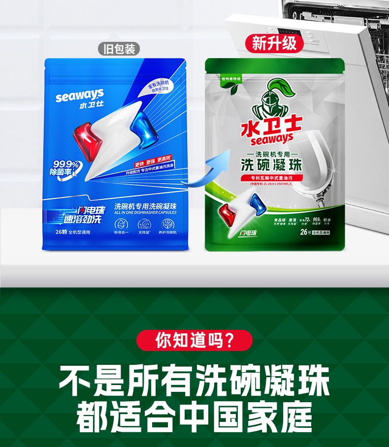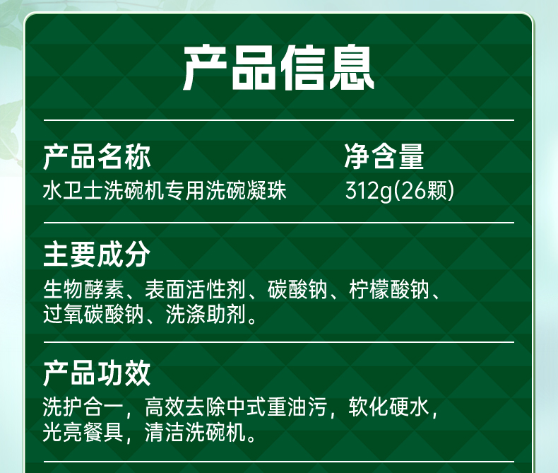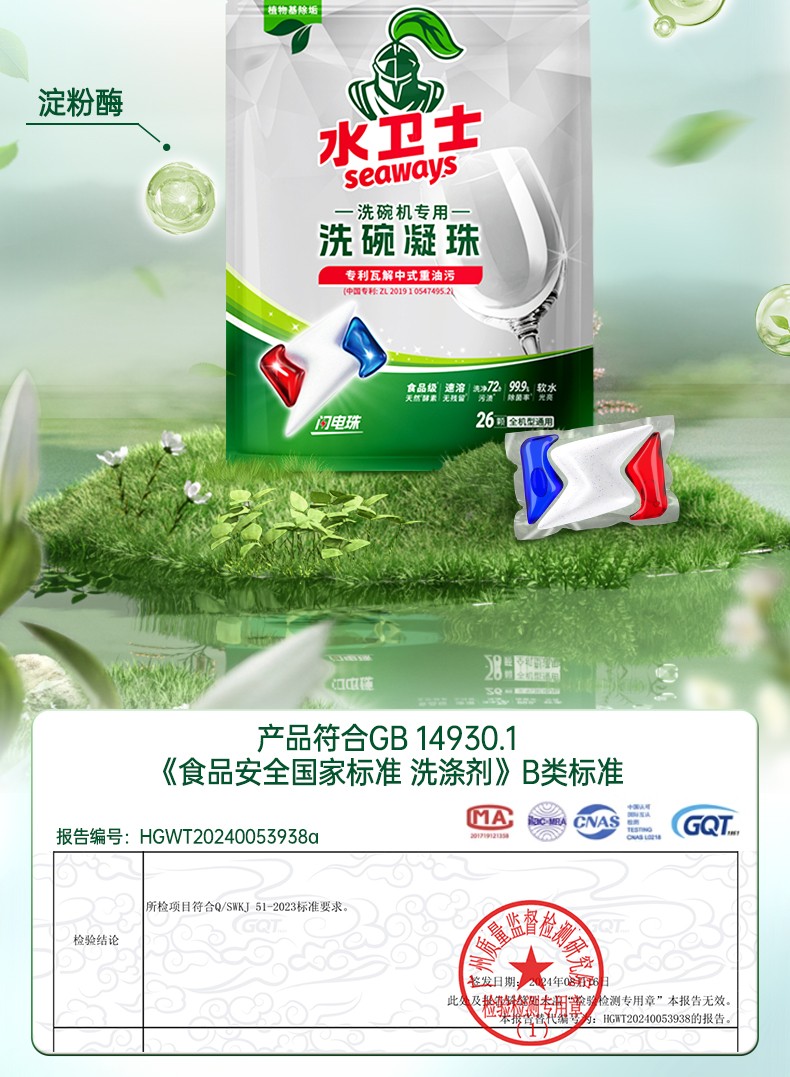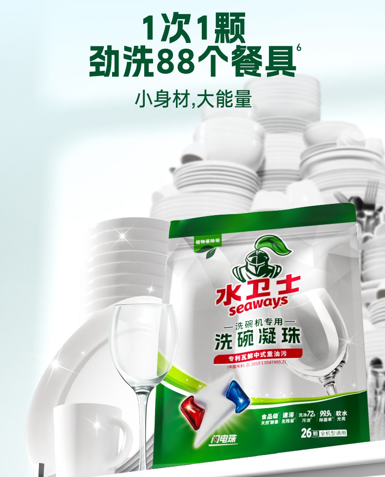 商品名称:(世星阳光) 水卫士 洗碗机专用洗碗凝珠 12g*26颗袋 闪电速溶 免预洗 食品级天然酵素