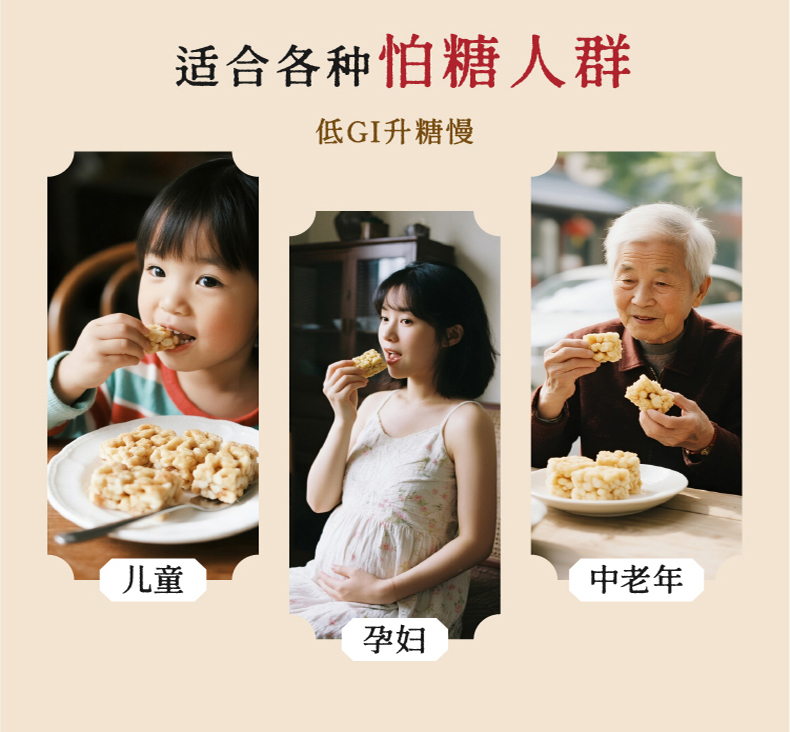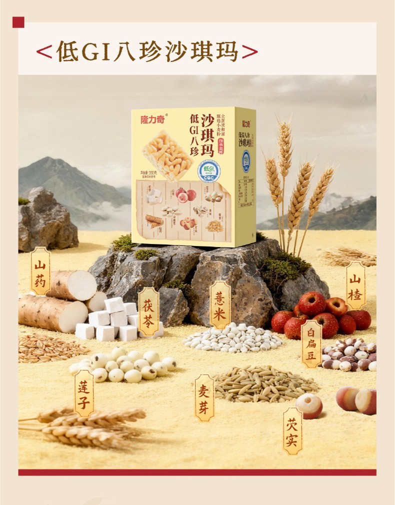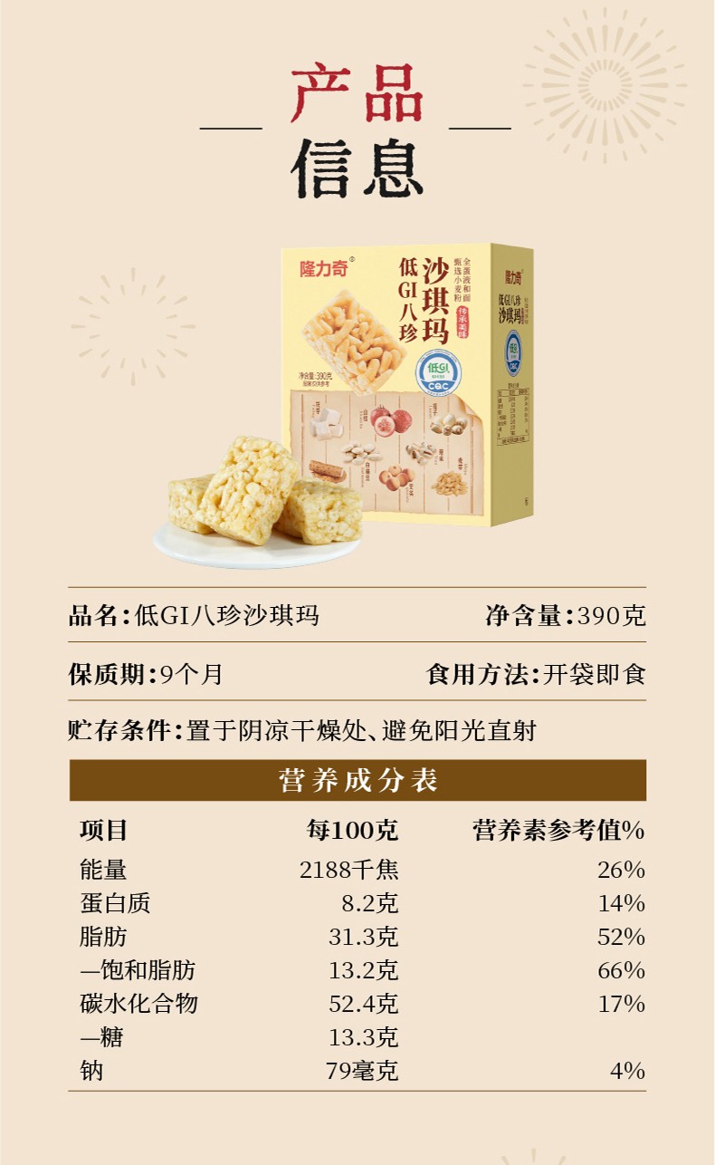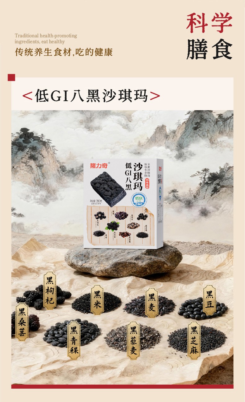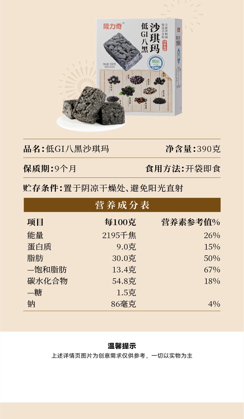 商品名称:(巨邦佑)BJ+隆力奇低GI八珍八黑沙琪玛 390g*3盒 低GI科学膳食