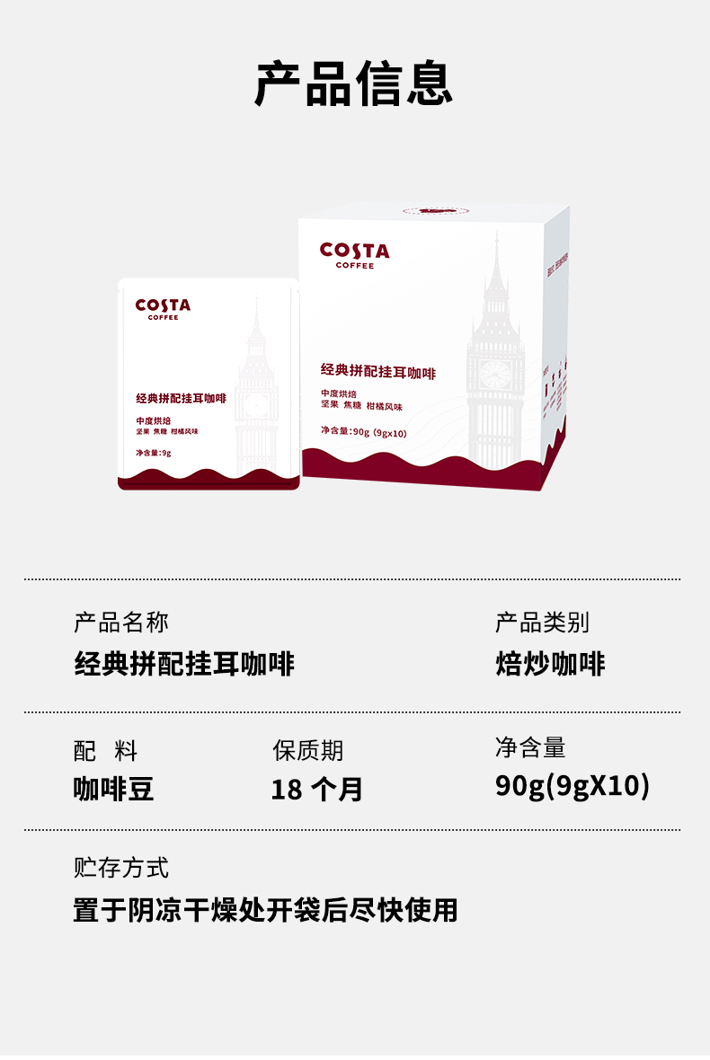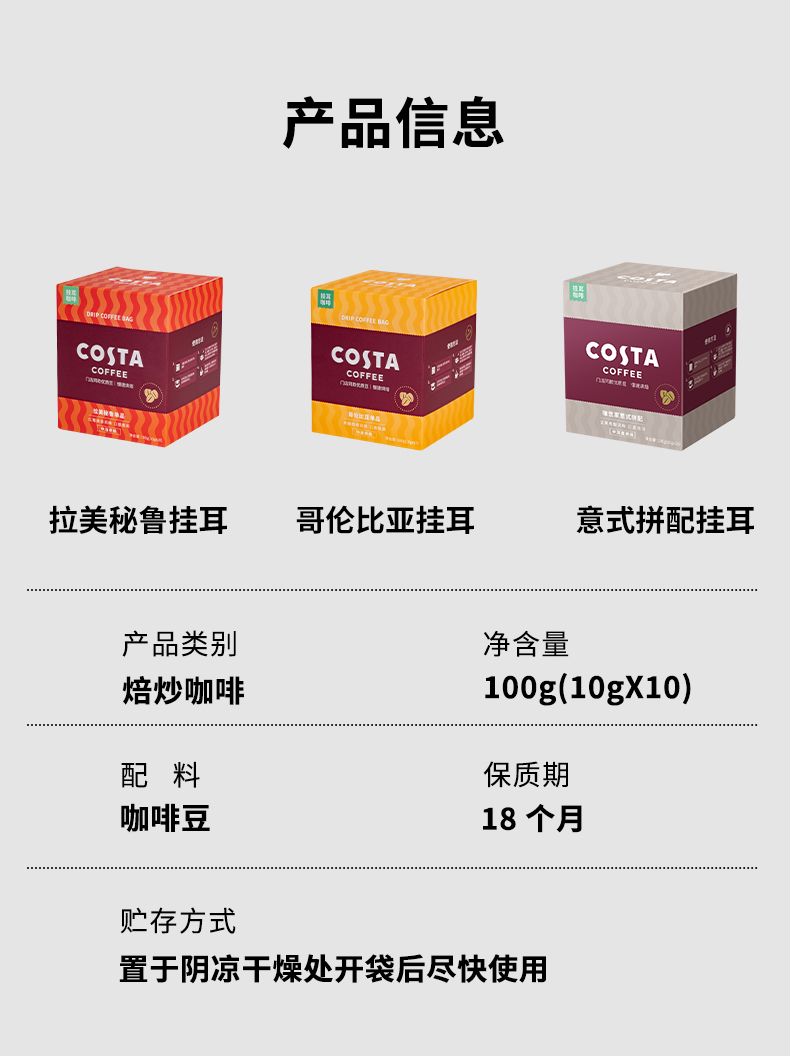 商品名称:(巨邦佑)BJ+COSTA 咖世家缤纷挂耳咖啡囤货装390g 手冲滴滤咖啡美式黑咖啡精品咖啡粉现磨