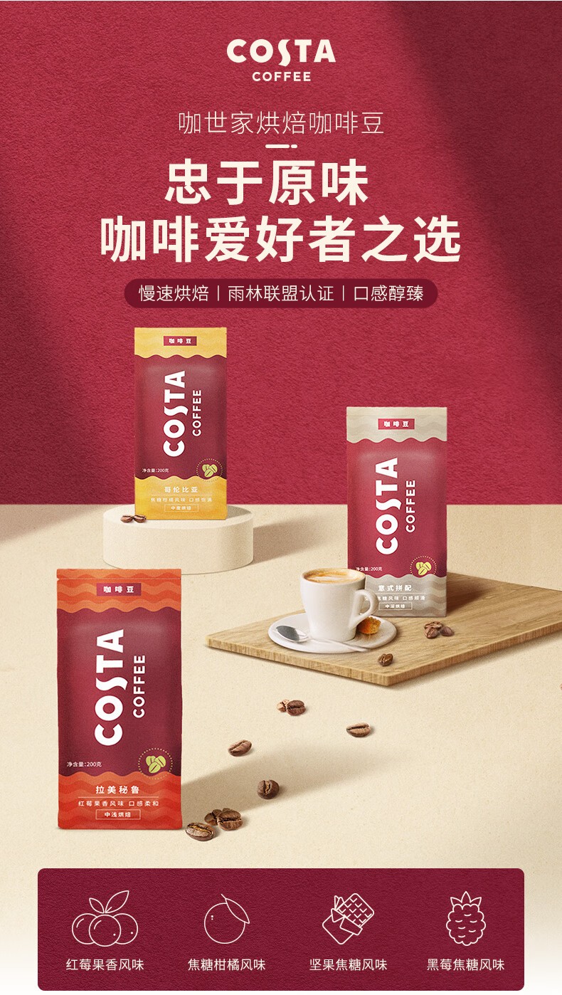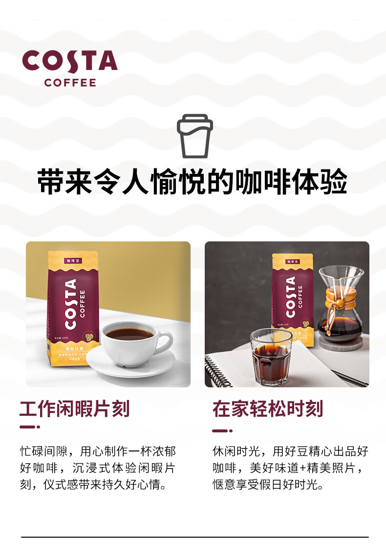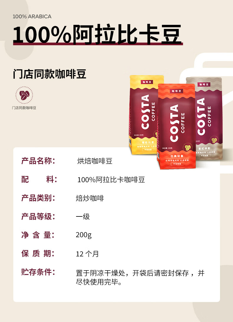 商品名称:(巨邦佑)BJ+COSTA 咖世家烘培咖啡豆 200g 慢速新鲜烘焙手冲拿铁美式