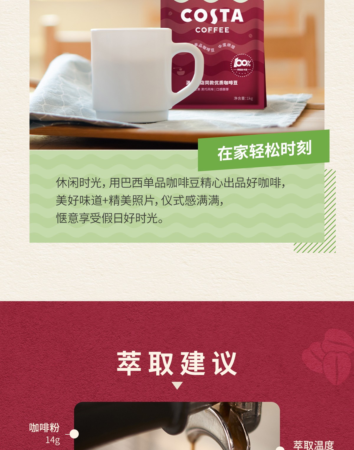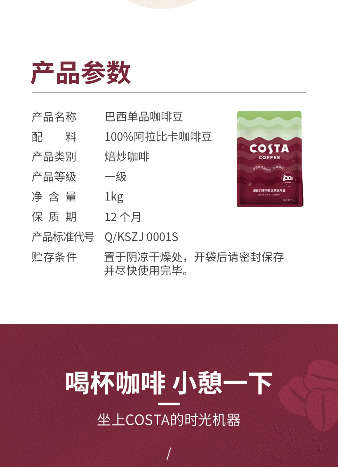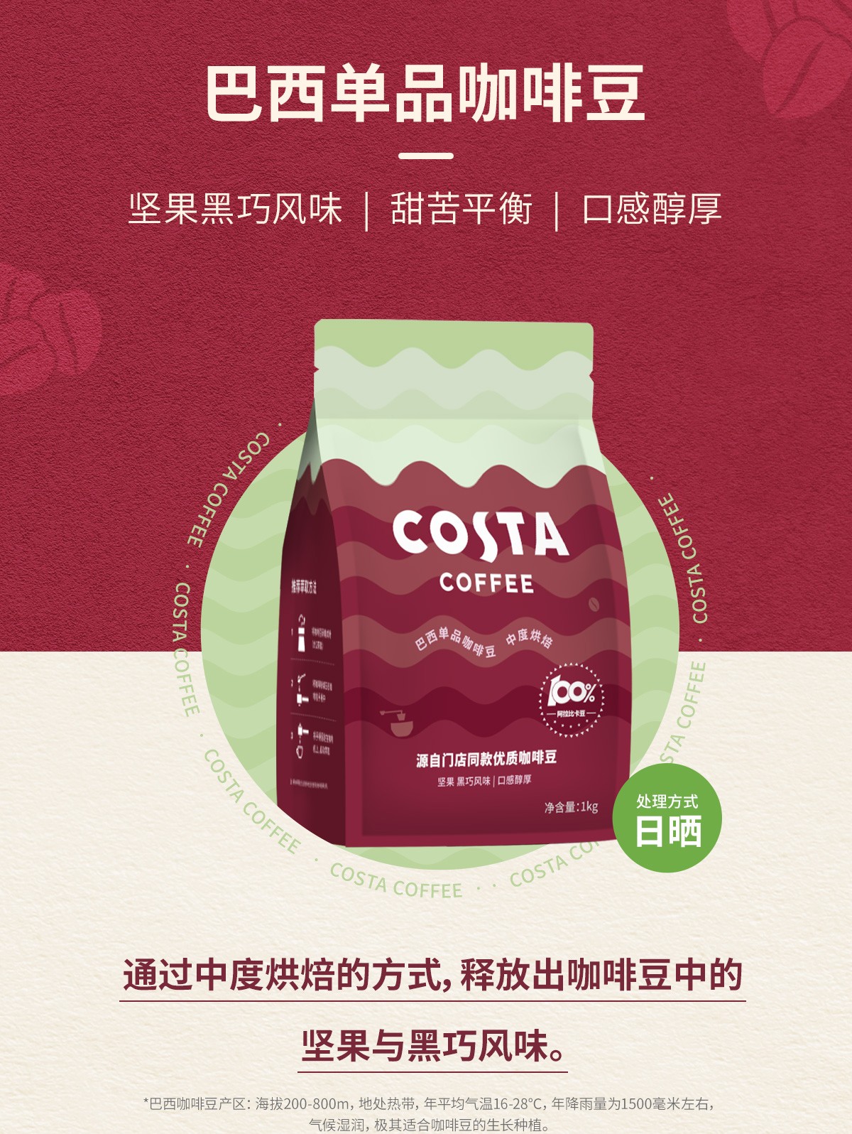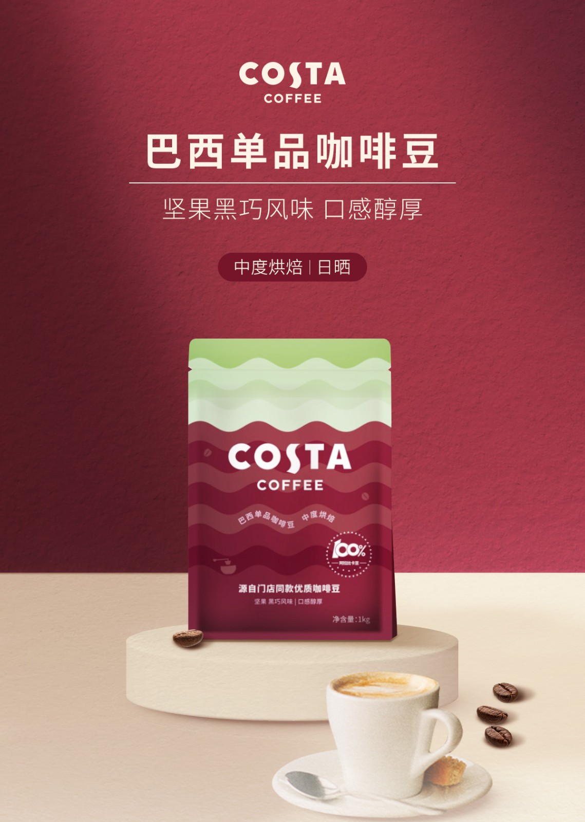 商品名称:(巨邦佑)BJ+COSTA 单产地巴西豆 1kg 100%阿拉比卡中烘焙豆精品巴西单品豆