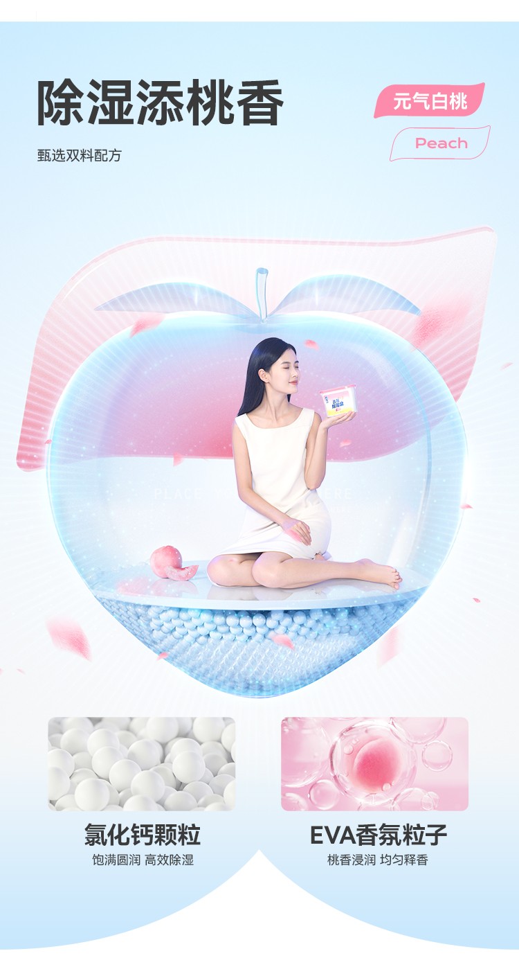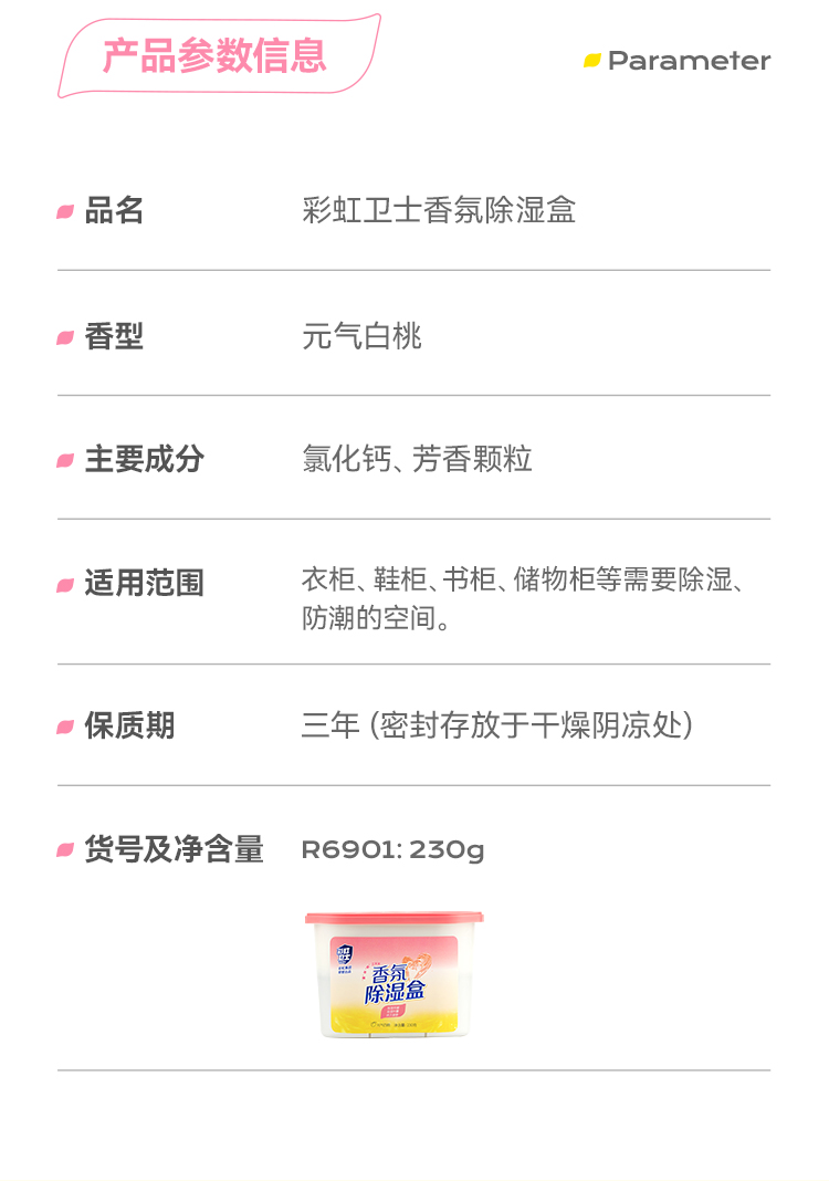 商品名称:(巨邦佑)T+ (yp)彩虹卫士香氛除湿盒元气白桃6盒装 除湿袋除湿盒干燥剂室内房间汽车吸湿防霉剂持久留香多场景适用